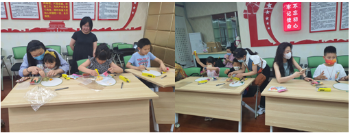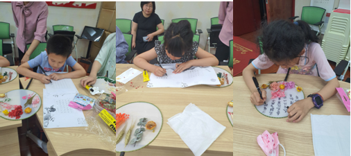 大家在书法老师的细心指导下,在自己亲手制作的团扇上一笔一划的写下了心仪的诗词,将端午的诗情画意镶嵌在一枚小小的干花团扇中。
